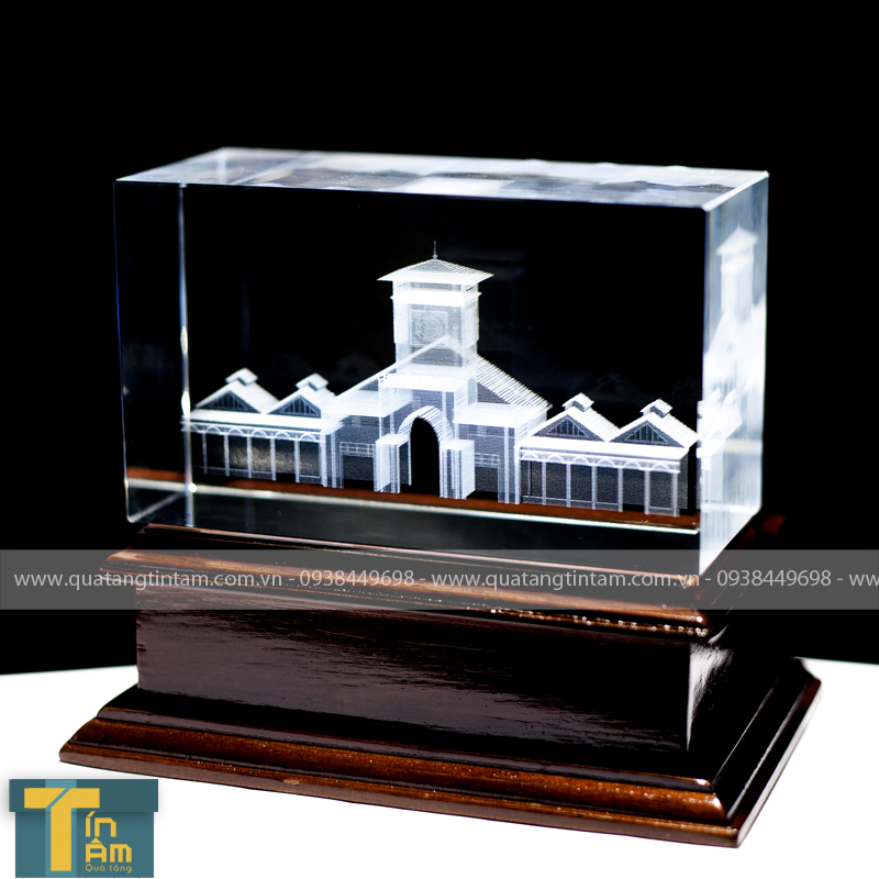 Bức ảnh Chợ Bến Thành, được thiết kế 3D, sau đó bắn lazer hình vào trong giữa khối pha lê trong suốt.